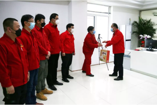 因为大部分的医护家属们都在抗“疫”一线或隔离状态,慰问活动只能在公司会议室与公司职工面对面进行。在会议室,公司领导班子成员对职工们的生活情况进行了仔细询问,并着重了解他们生活中的实际困难。同时,公司为他们送上了生活必需品,把关爱员工,尤其是家属奋战在防疫一线的职工落到实处。