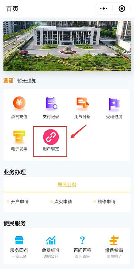• 全部绑定完成后,点击首页的“用户绑定”可查看并切换当前登录的燃气账户。