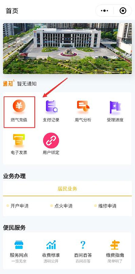 • 非IC卡用户点击首页的“燃气充值”,会直接跳转至缴费详情页面,可直接点击页面预设定的充值金额进行整数金额缴费,或在“其他金额”处填写指定金额进行缴费。